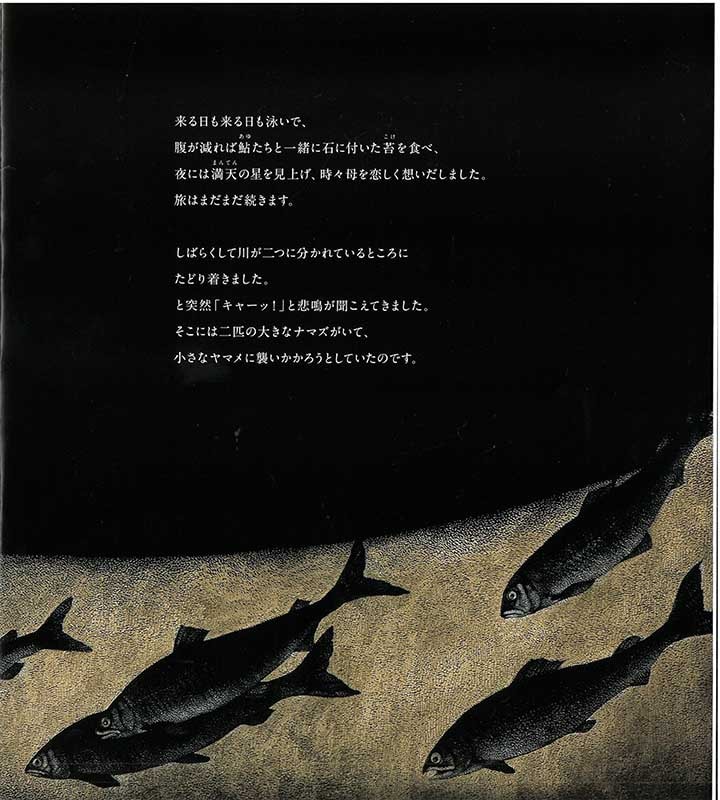 この絵本の原画は、漆塗りのパネルに絵を彫り、金粉や金